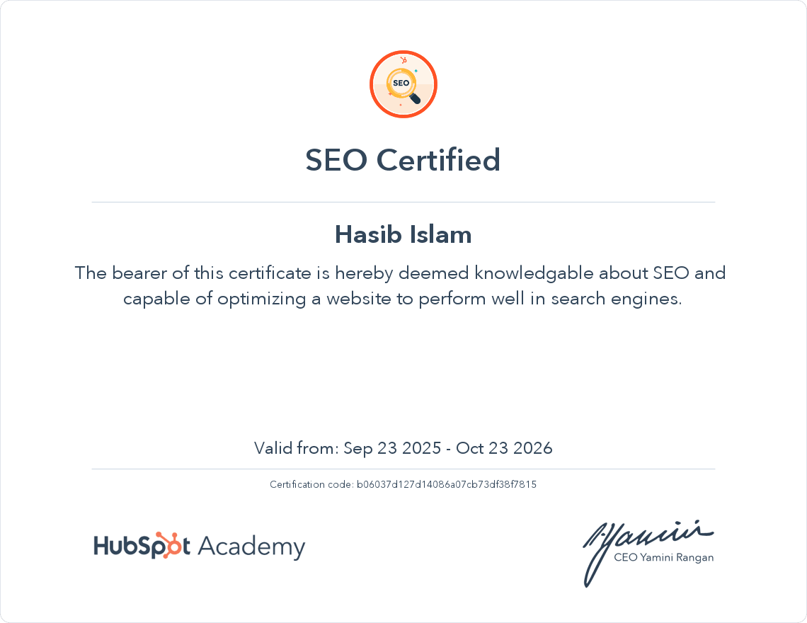 This certification validates our comprehensive and up-to-date knowledge of core SEO principles, covering everything from technical audits and link building to effective content strategy.