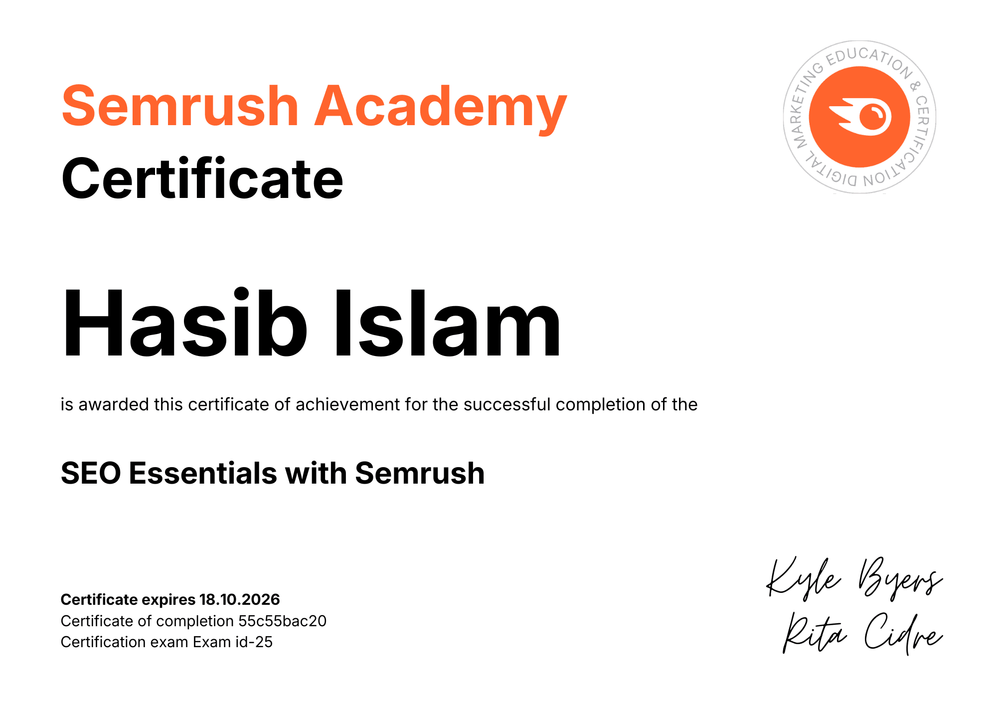 This certification validates our comprehensive understanding of essential SEO fundamentals, including technical requirements, advanced keyword research, and ethical link-building practices. Crucially, it confirms our expertise in utilizing the industry-leading Semrush toolset for deep competitor analysis and accurate site diagnostics.