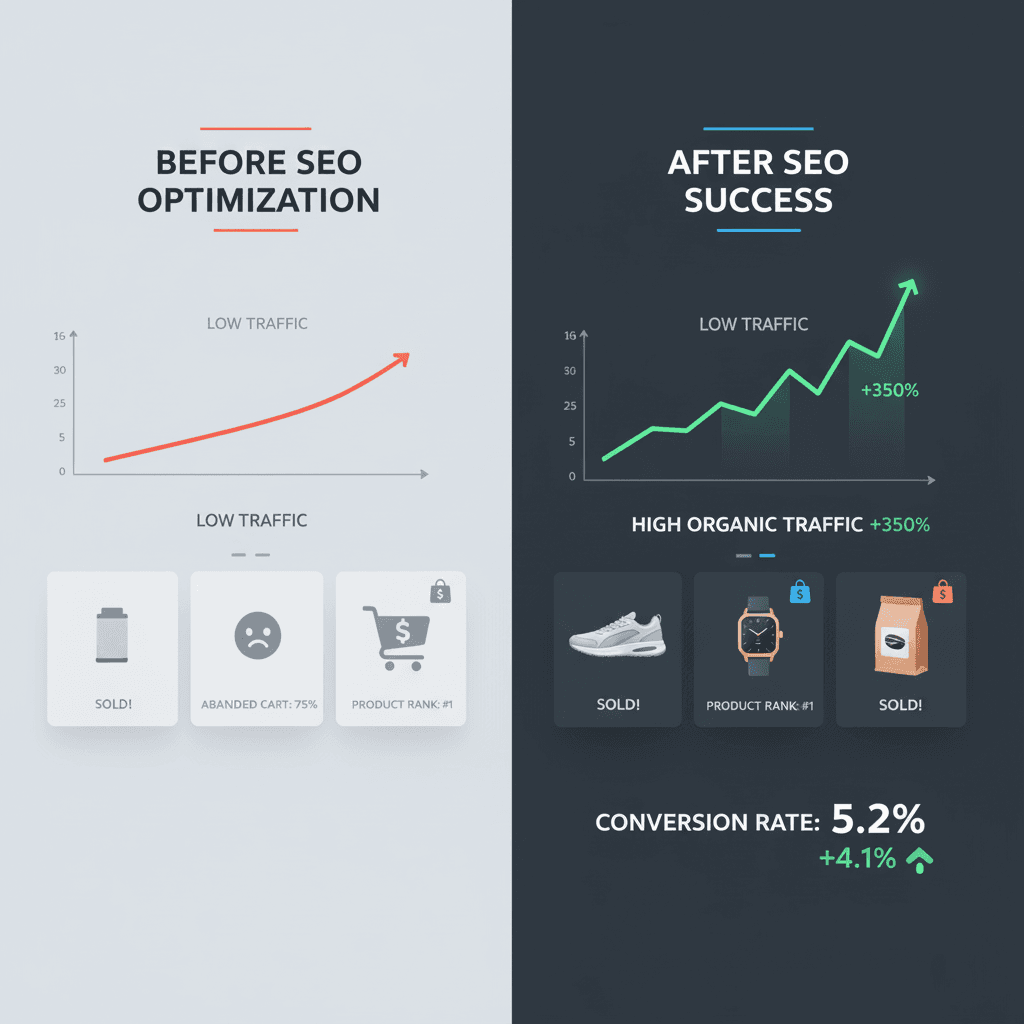 This visual is a direct comparison showing the measurable transformation our specialized services deliver. It moves your online store from struggling with visibility to dominating product search results.