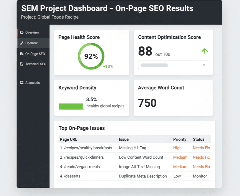Our Solution: Executed a comprehensive On-Page SEO overhaul over 6 weeks. This included optimizing all Title Tags and Meta Descriptions, restructuring content using proper Header Tags (H1-H3), optimizing over 500 product images for speed and Alt Text, and implementing strategic Internal Linking.